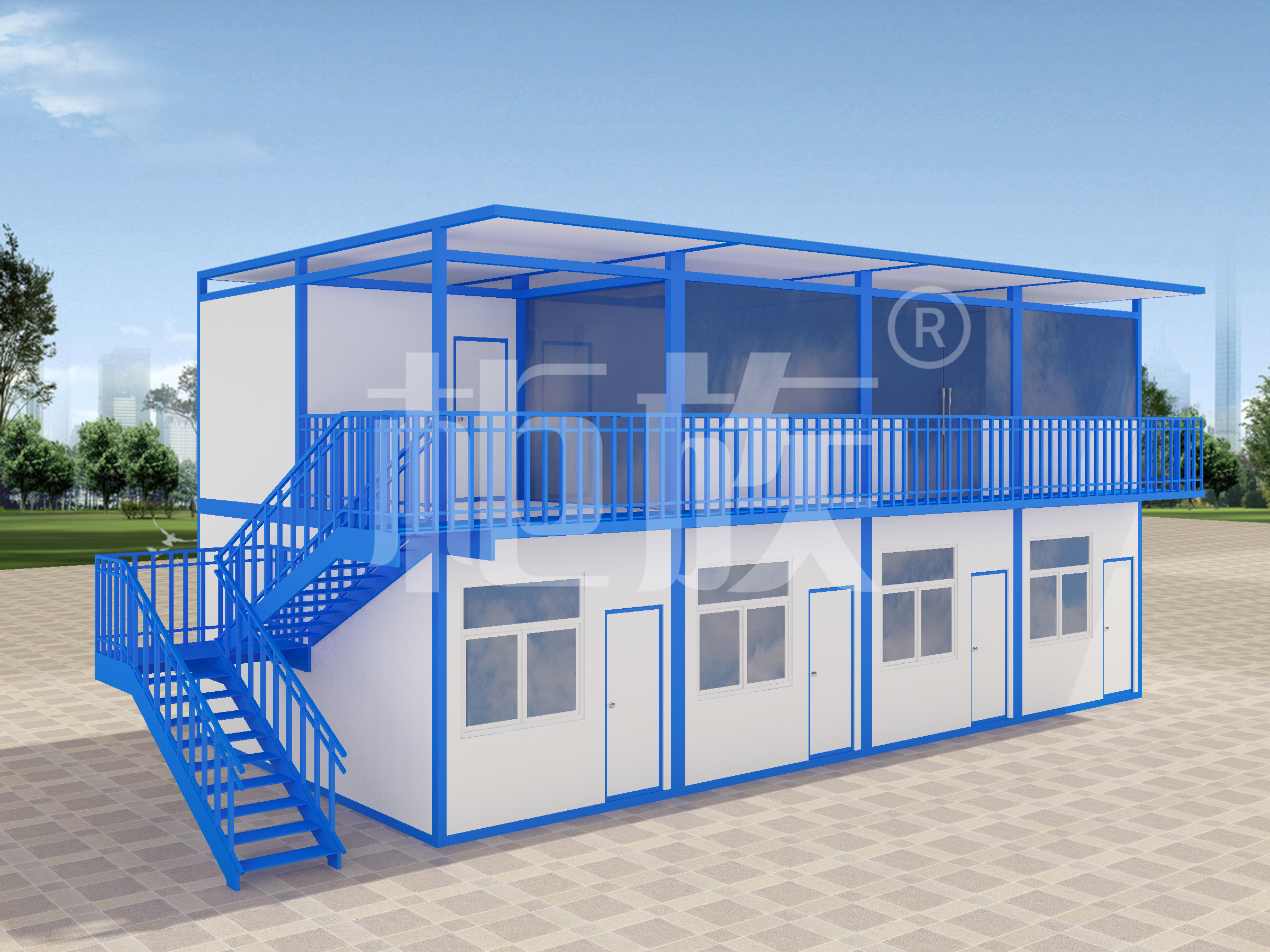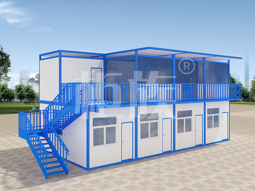 Multiple containers are spliced together, the blue and white appearance is simple and smooth. Factory production, finished products are directly transported to the use of the site, complete supporting facilities, ready to use.
