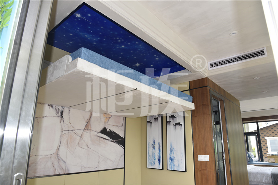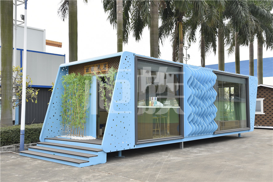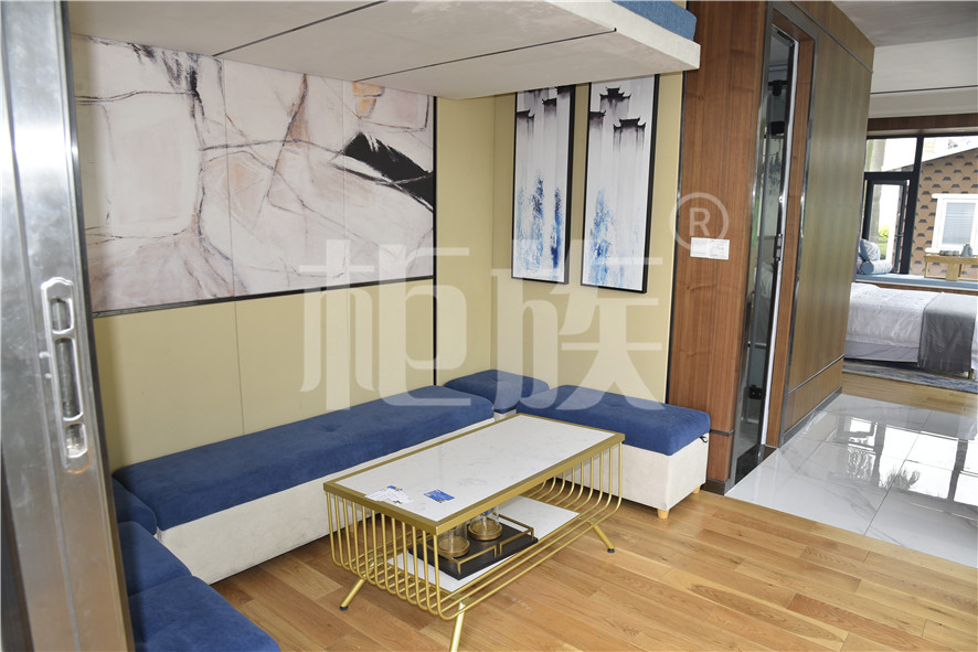 功能布局:入戶臺階,箱子整體抬高,前廳設吧臺和茶幾,樓面為隱藏式升降床,中部為衣柜、洗手臺及衛(wèi)生間,臥室內(nèi)帶飄窗陽臺,配影音系統(tǒng)。大面積落地玻璃窗,適合觀景。設計用途為景區(qū)特色民宿。